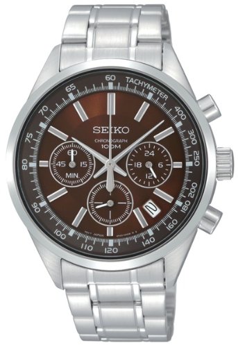 Stainless steel case with a stainless steel bracelet. Fixed stainless steel bezel. Brown dial with silver-tone hands and index hour markers. Minute markers. Tachymeter around the outer rim. Dial Type: Analog. Luminescent hands and markers. Date display between the 4 and 5 o'clock positions. Chronograph - three sub-dials displaying: 60 second, 60 minute and 24 hour. Quartz movement. Scratch resistant Hardlex crystal. Pull / push crown. Solid case back. Case diameter: 40 mm. Case thickness: 11 mm. Round case shape. Band width: 19 mm. Band length: 8.25. Deployment clasp with push button release. Water resistant at 100 meters / 330 feet. Functions: chronograph, date, hour, minute, second. Casual watch style. Seiko Chronograph Brown Dial Stainless Steel Mens Watch SSB041.