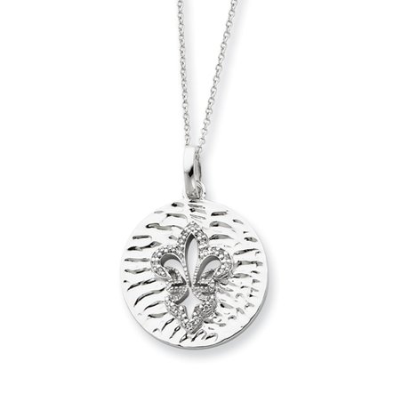 Beautifully crafted from rhodium plated Tarnish resistant rhodium plated silver and accented with cubic zirconia. The back is inscribed with "Whatever is pure and lovely think on these things." It has an textured and polished finish and is 18 inches long with a spring ring clasp. Pendant measures 1" in diameter. Each necklace includes a card with an inspirational poem about purity and verse printed in English and Spanish.