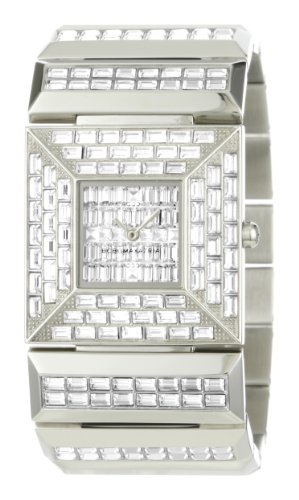Casual watch, Japanese quartz movement, Polished silver-tone hands, Silver dial with pave rhinestone detailing, Wide polished silver-tone metal bracelet with rhinestone detailing, adjustable links and jewelry-clasp, Polished silver-tone stainless steel bezel adorned with rhinestones, Slim polished silver-tone stainless steel square case, Polished steel crown with logo, Stainless steel caseback, Water resistant