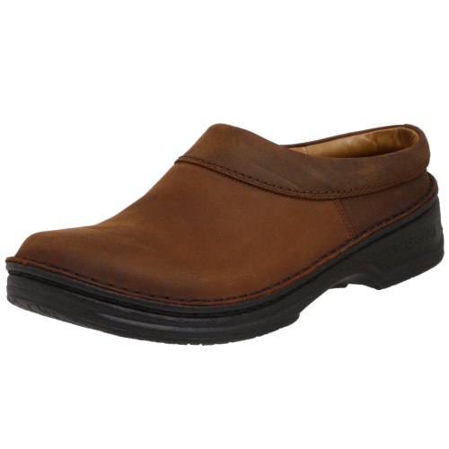 Hand-stitched slip-on clog with a semi-enclosed heel for a more secure fit. Removable footbed.