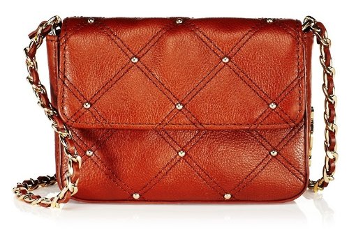 We are loving the Frankie leather crossbody because it's small enough to be a wear-all-day accessory but large enough to carry everything you need. Braided leather-and-gold link strap. Quilted gold rivet studs. New JC logo on side flap. Magnetic closure. Interior pocket.