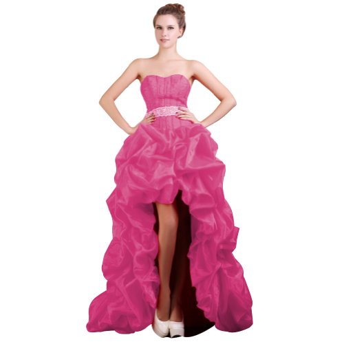 Classic hi-lo formal dress. Designed in a-line skirt with strapless neckline, this gown has ruffels in the skirt. Perfect for any formal occasion.